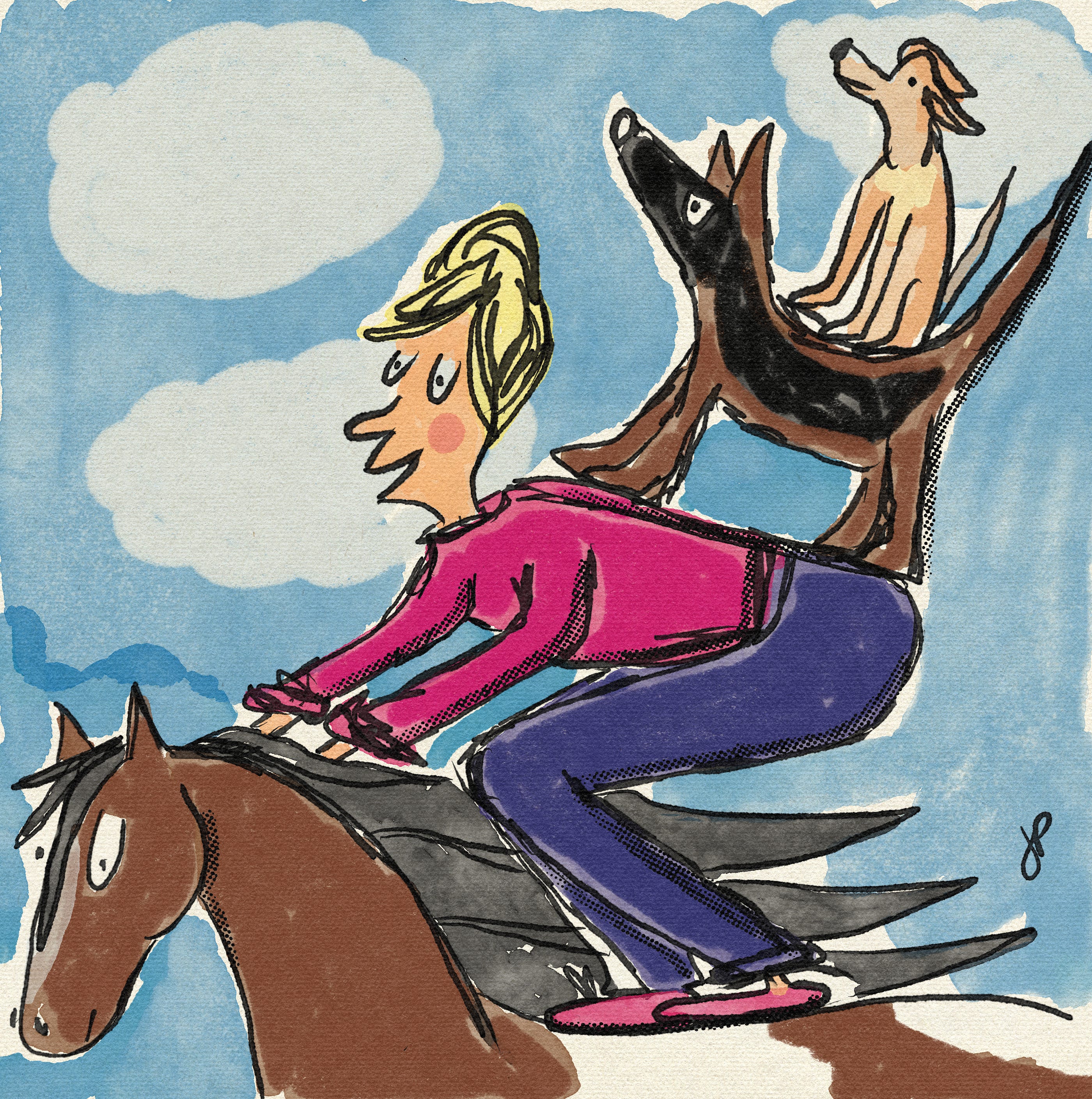 Anyway, I’ve gone a little off course because today’s happiness is actually about my dogs. Or, if we’re more specific, my dogs and horse as a glorious combination. You see, as I ride my patchy pony, Merc, around the farm, my dogs track right round with me.